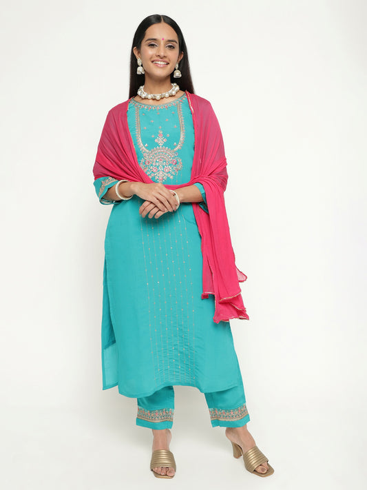 Aqua Colour Blend Silk Embroidery Work Party Wear Kurta Pant Dupatta Set For Women's