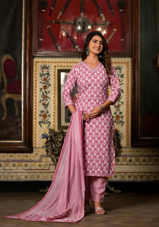 Baby Pink Printed Casual Wear Kurta Set with Bottom wear and Dupatta