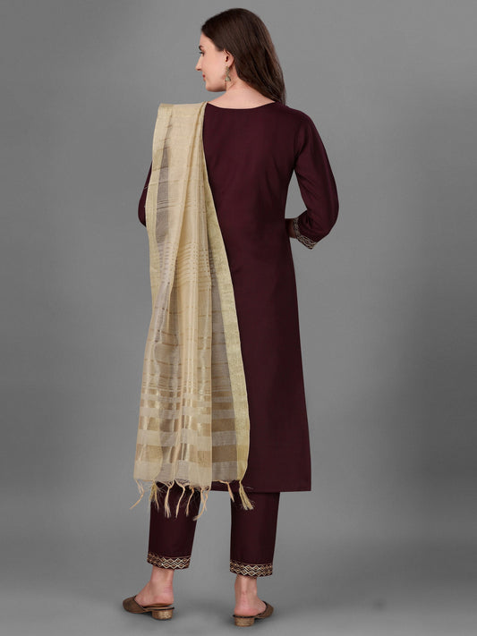 Womens Maroon Colour Cotton Kurta Pant With Dupatta Set