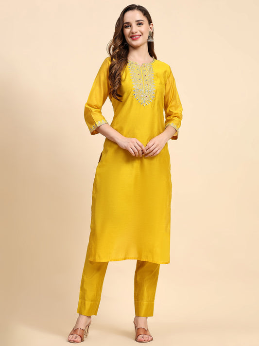 Yellow Colour Blend Silk Embroidery Work Party Wear Kurta Pant Dupatta Set For Women's