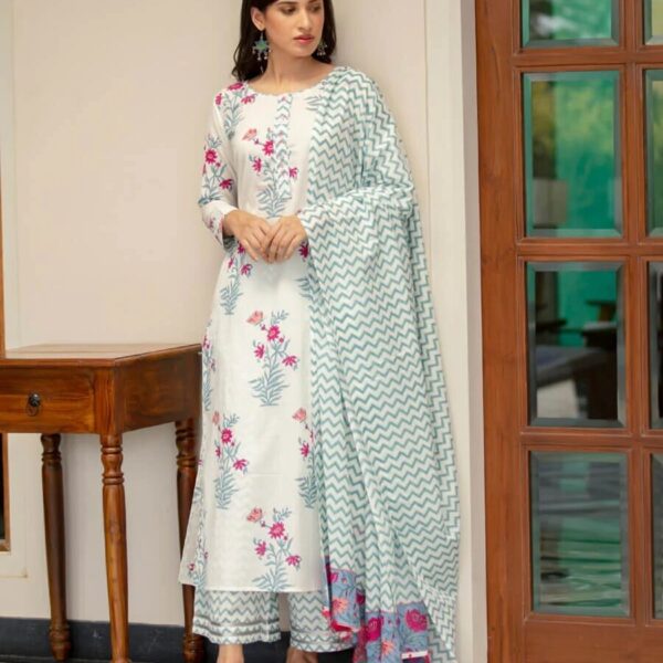 Leaf Green & White Fancy wear Kurti With Bottom Dupatta set