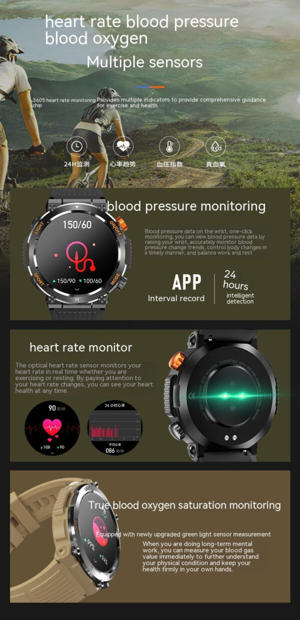 Functions: Waterproof, photographing, step counting, heart rate monitoring, blood pressure measurement, Bluetooth call, remote control selfie, sleep monitoring, blood oxygen detection