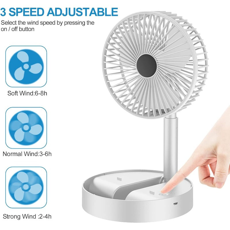 - The fan features an adjustable height, ranging from 8 to 36 centimeters, thanks to a stretchable aluminum alloy tube. Its compact, foldable design makes it suitable for use on kitchen tables, office desks, or at home.