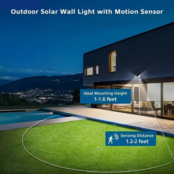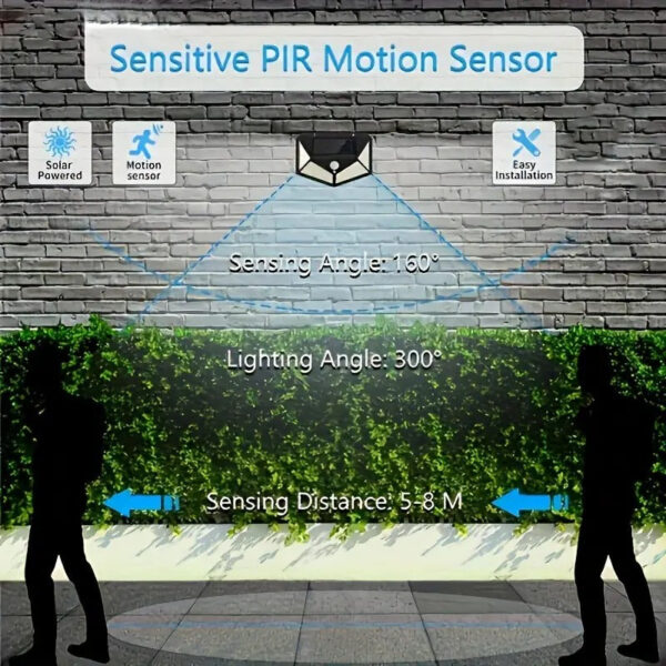 - Features a smart motion sensor with a 120° detection angle and 8-meter range, offering three modes: full brightness on motion, full brightness followed by 50% after 15 seconds, or a continuous 50% brightness mode throughout the night.
