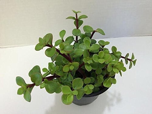 The jade plant is an evergreen with thick branches. It has thick, shiny, smooth leaves that grow in opposing pairs along the branches. Leaves are a rich jade green, although some may appear to be more of a yellow-green. Some varieties may develop a red tinge on the edges of leaves when exposed to high levels of sunlight. New stem growth is the same colour and texture as the leaves, becoming woody and brown with age. It grows as an upright, rounded, thick-stemmed, strongly branched, evergreen shrub and reaches stature heights of up to 2.5 meters. The base is usually sparsely branched. Sometimes a single main trunk of up to 6 centimetres in diameter is formed. The succulent shoots are gray-green. The bark of older branches peels off in horizontal, brownish stripes. The oppositely arranged, ascending to spreading, green leaves are stalked with up to 5 millimetres short. The fleshy, bare, obovate, wedge-shaped leaf blade is 3 to 9 centimetres long and 1.8 to 4 centimetres wide. The sharp-edged leaf margins are often reddish. Numerous varieties and cultivars have been selected, of which C. ovata ‘Hummel’s Sunset’ has gained the Royal Horticultural Society’s Award of Garden Merit.