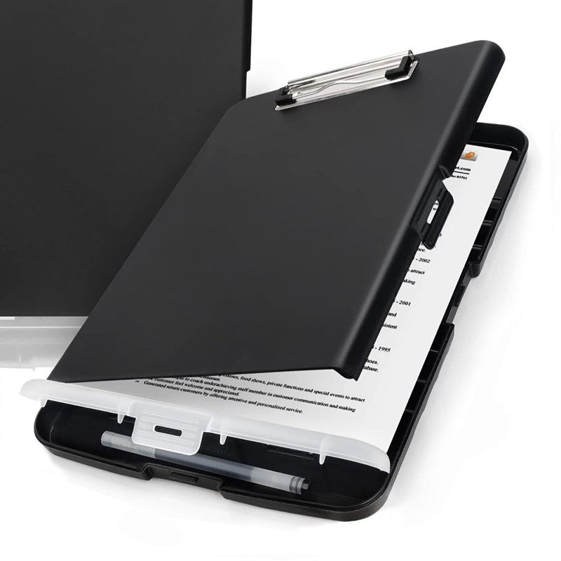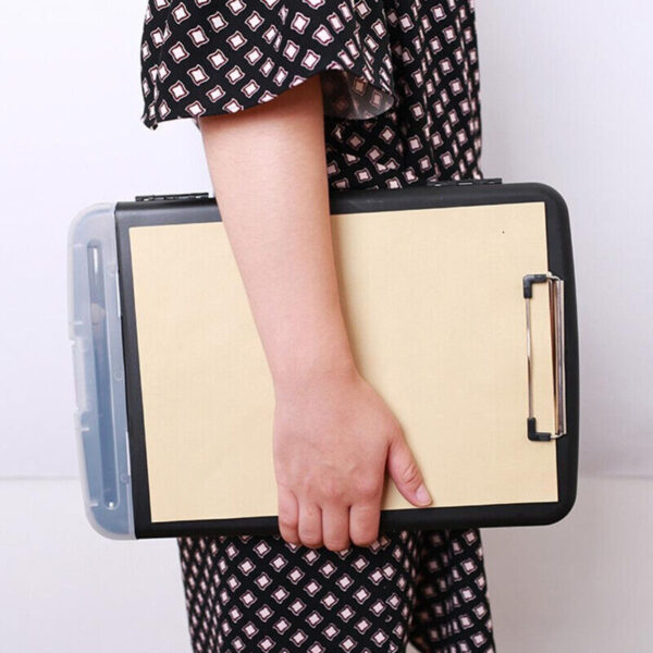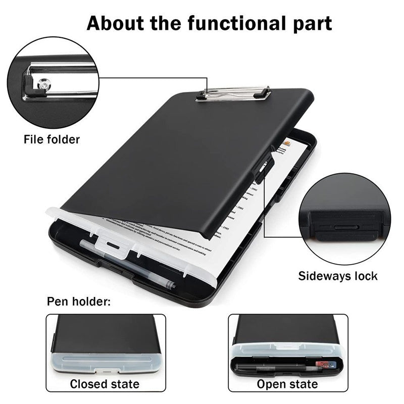 Storage Plastic Clipboard can holds 200 plain A4 papers, enough storage space for letter-size documents, forms, and notepads. Built-in pencil case on the bottom for storing commonly used pens and erasers. The sturdy self-locking latch is easy to open up with one hand.